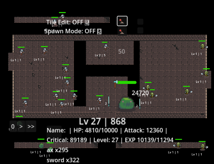 Implemented a tile editor system and a character spawning system. Players can now edit tiles within the camera’s range and spawn a boss character to make battles more engaging. Next, I’ll focus on adding more tile types, expanding character spawning, and introducing item drops.